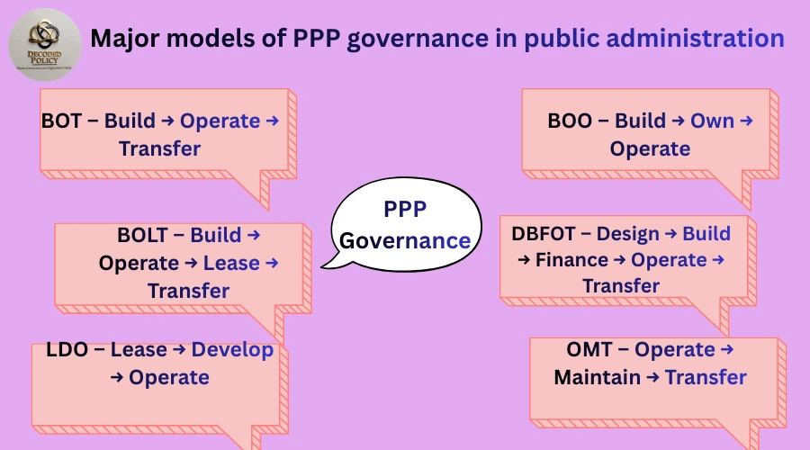 To effectively implement PPP governance in public administration, different operational models are used. Each model has slightly different structures, risk-sharing patterns, and public policy objectives, which impact good governance outcomes.